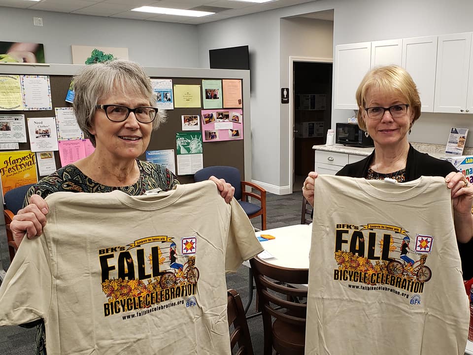 Bike Friendly Kalamazoo Founder Paul Selden and Vicksburg Village President Bill Adams delivered cash and food totaling more than $350 to South County Community Services Director Danna Downing and Generous Hands Executive Director Sheri Louis today. The donations were gathered during Vicksburg’s inaugural Fall Bike Celebration. The ladies were also given commemorative tee shirts.